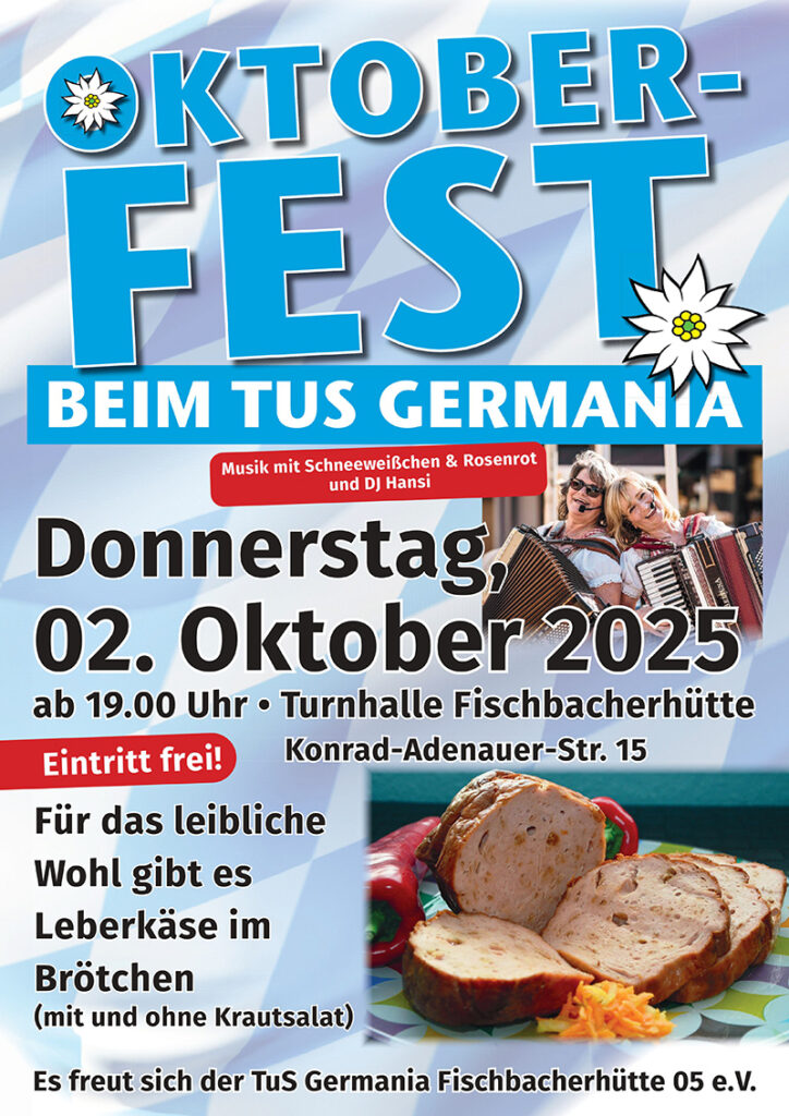 Der TuS Germania lädt herzlich zum traditionellen Oktoberfest ein. Am Donnerstag, 2. Oktober, heißt es ab 19 Uhr in der Turnhalle Fischbacherhütte wieder „O’zapft is!“.