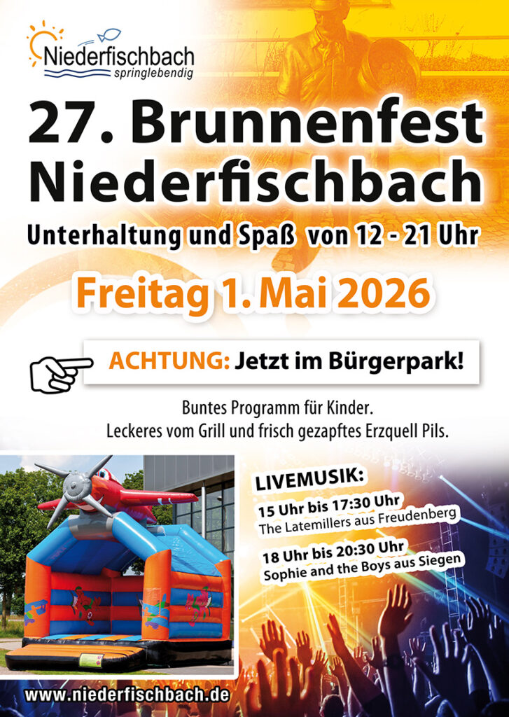 Niederfischbach. Die Aktionsgemeinschaft Niederfischbach lädt am Freitag, den 1. Mai 2026, zum mittlerweile 27. Brunnenfest in den Bürgerpark ein. Von 12 bis 21 Uhr erwartet die Besucherinnen und Besucher ein abwechslungsreiches Programm für die ganze Familie.